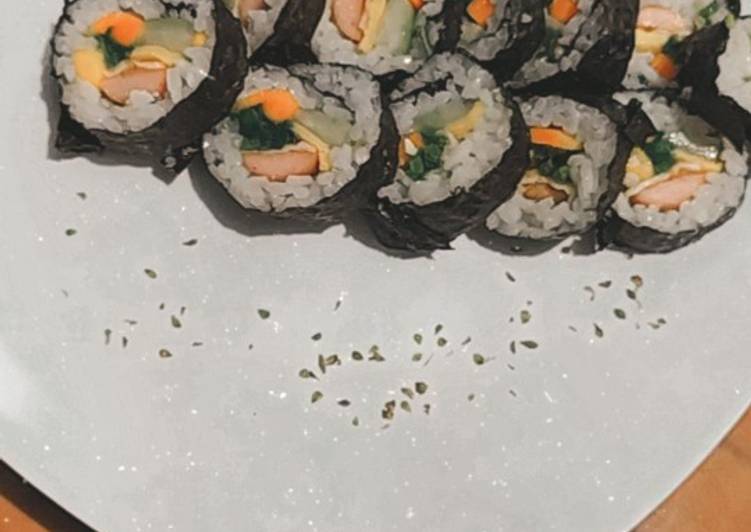 Kimbab!. Gimbap (김밥) is a Korean-style makizushi, a sushi roll, made from cooked rice and other ingredients that are rolled in gim—dried sheets of seaweed—and served in bite-sized slices. A popular Korean picnic food - Easy kimbap (Korean sushi roll) recipe! Bite sized little rice and vegetable goodies are savory, nutty and delicious!